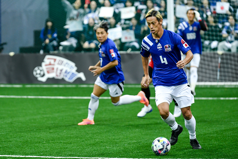 試合は5対5のミニゲーム形式で15分×4クォーターのトータル60分。日本チームは、本田圭佑の強烈なミドルシュートや柿谷曜一朗のバイシクルシュートといった、世界を相手に戦ってきた選手たちの豪快な技で相手ゴールを脅かします。